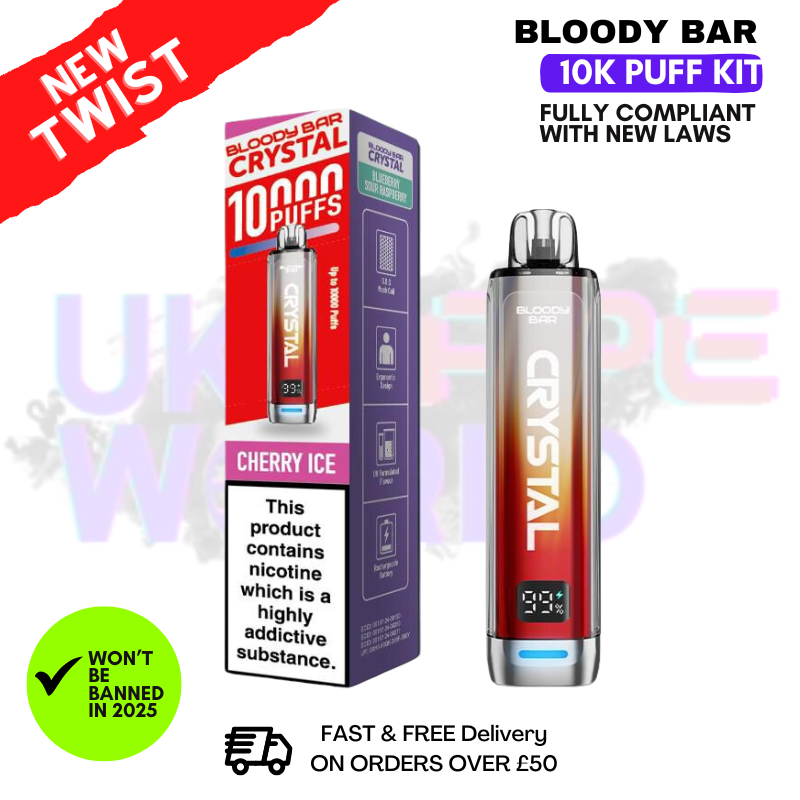 Shop Bloody Bar Crystal Cherry ICE 10K Puff Pod Kit delivers a combines the sweet and tangy taste of ripe cherries with a sparkling, fizzy twist, creating a refreshing and effervescent flavor experience.