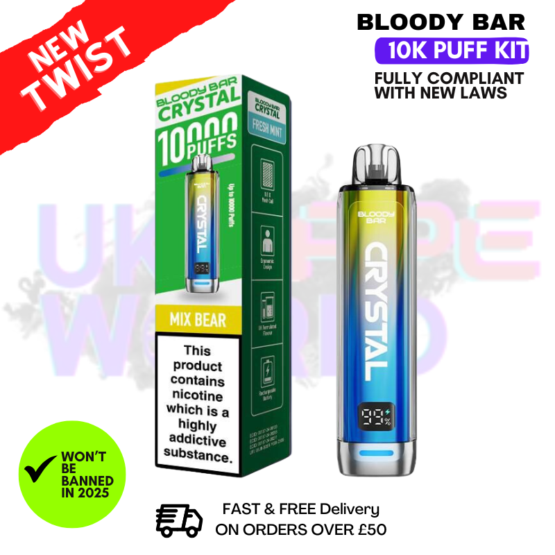 Shop Bloody Bar Crystal Mix Bear 10K Puff Pod Kit delivers a playful fusion of fruity gummy bear flavors, blending sweet and tangy notes for a chewy, candy-inspired taste sensation.