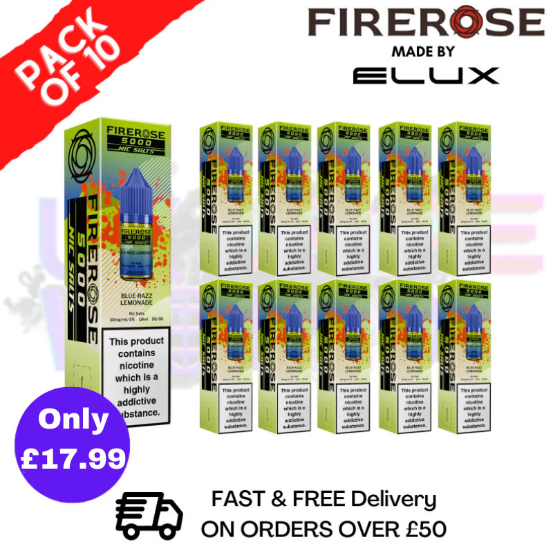 Firerose 5000 Nic Salt Box Of 10 by Elux offers an enhanced vaping experience with its new 10ml Nicotine Salt bottles, designed for convenience and longevity.