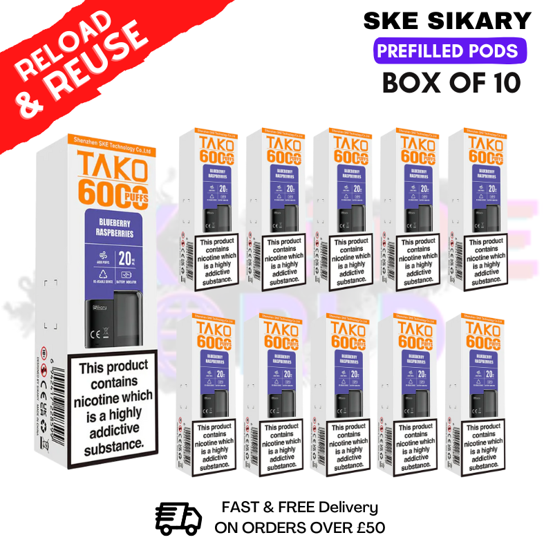 10 x SKE Sikary 6K Replacement Pods – Blueberry Raspberry Flavour