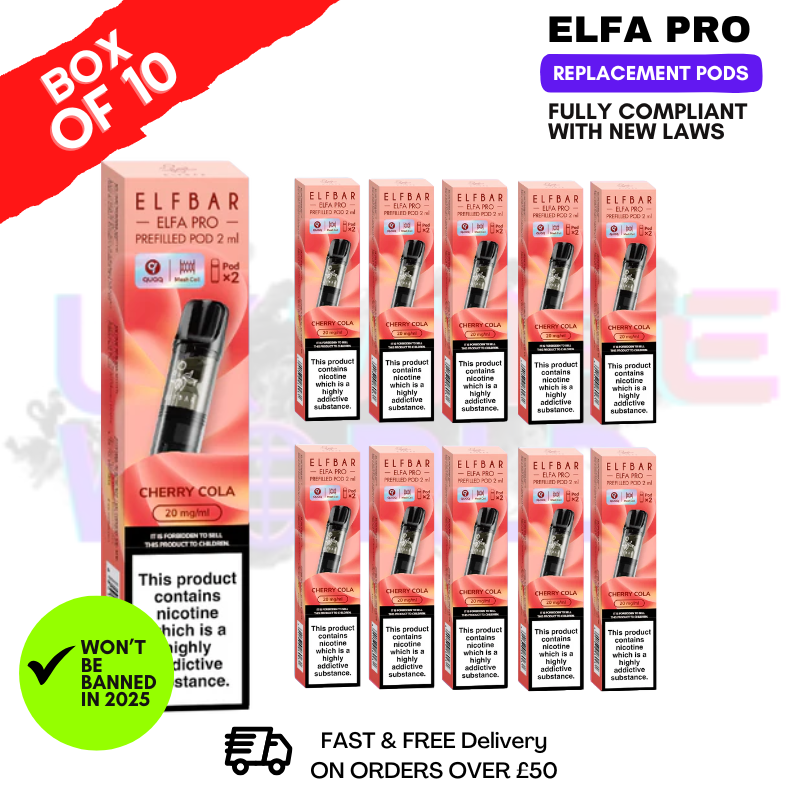 Shop Cherry Cola Elf Bar Elfa Pro Prefilled Pod Box Of 10 is a fizzy fusion of bold red fruit and classic soda sweetness, delivering a tangy, refreshing vape with nostalgic notes and a smooth, bubbly finish that’s full of flavour. A perfect addition to the ELF Bar Elfa Pro Pods Range!