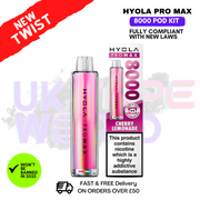Shop Cherry Lemonade Hyola Pro Max 8000 Puff Prefilled Pod Kit is a vibrant mix of sweet cherry and zesty lemonade, delivering a smooth, fruity vape with a perfect balance of bold sweetness and tangy citrus refreshment. A Perfect addition to the Hyola 8000 Prefilled Pod Kit Range!