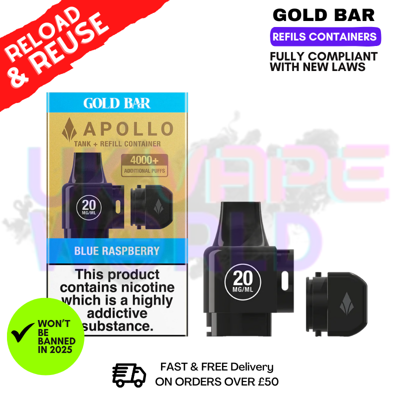 Shop Blueberry Raspberry Gold Bar 20K Apollo Replacement Tank + 5ML Refil is a tangy burst of mixed wild fruits with a smooth, juicy finish, offering a layered vape full of sweet and sharp notes that keep each inhale refreshing and flavour-packed!
