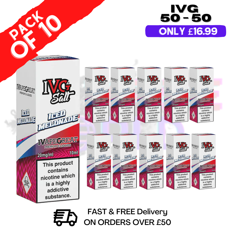 Iced Melonade IVG 50/50 Eliquid Box Of 10 is a refreshing fusion of sweet melon and tangy lemonade, finished with a crisp icy chill, delivering a cool and revitalizing fruity experience. A perfect addition to the IVG 50/50 Range!