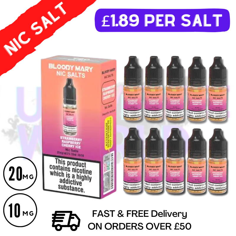 Strawberry Raspberry Cherry ICE - Bloody Mary Nic Salt E-Liquids Pack Of 10 Deal A trinity of berries—sweet strawberry, tart raspberry, and succulent cherry—entwined in an icy embrace for a refreshing and exhilarating vaping experience.