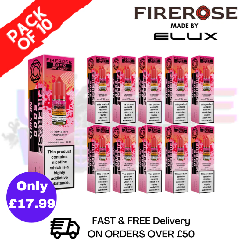 Firerose 5000 Nic Salt Box Of 10 by Elux offers an enhanced vaping experience with its new 10ml Nicotine Salt bottles, designed for convenience and longevity.