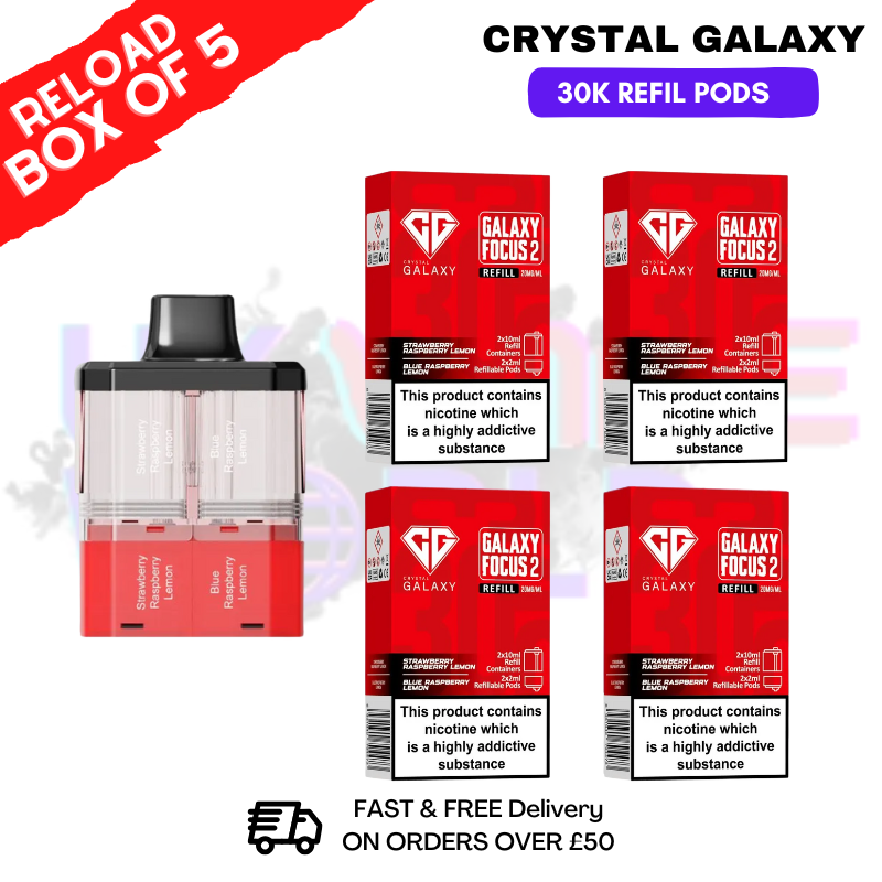 Buy the Strawberry Raspberry Lemon Crystal Galaxy 30K Pods (Box of 5) today at UK Vape World – for fresh peach flavour, mess-free swaps, and lasting satisfaction.