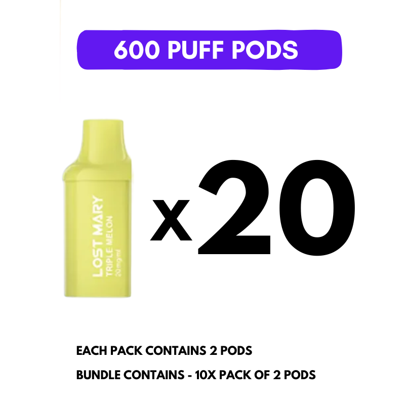 Triple Melon Lost Mary 600 Replacement Pods Box Of 10 an refreshing fusion of three juicy melons creates a smooth, sweet vape bursting with tropical flavour and mellow, fruity freshness in every puff.