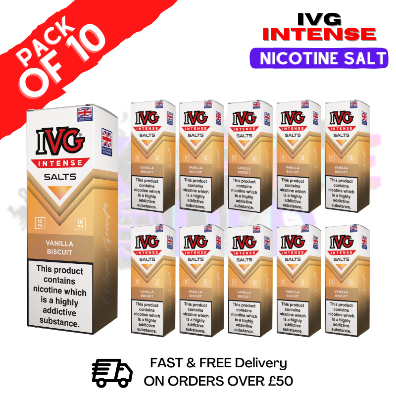 IVG Intense Nic Salt Box Of 10 is a buttery biscuit notes blend with smooth vanilla, delivering a warm, dessert-inspired vape that’s rich, sweet, and comfortingly indulgent from inhale to exhale.